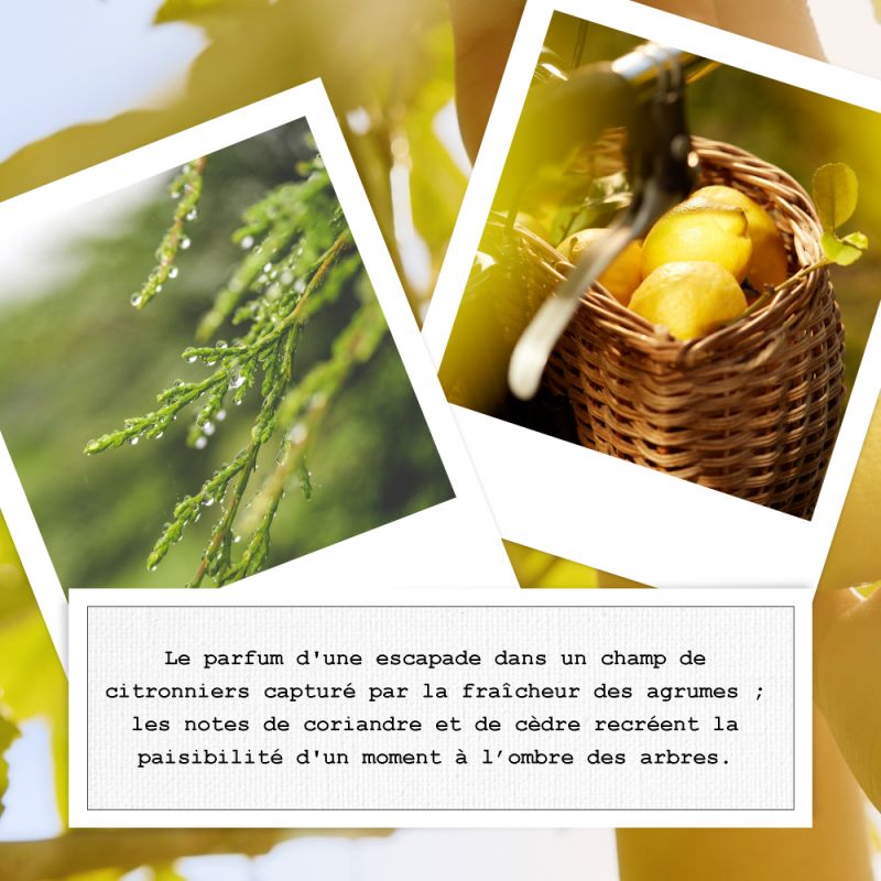 Composé comme un citronnier imaginaire, ce parfum vif est doté de notes d'agrumes fraîches et vivifiantes alliées à des notes vertes de coriandre, d'absolu de maté et de feuilles de thé. Le sillage boisé composé de cèdre et de muscs blancs complète l’évocation de ce symbole méditerranéen.